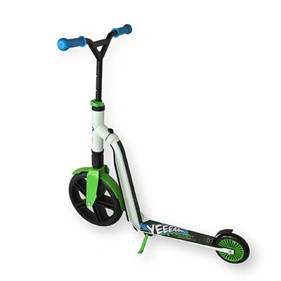 Несмотря на свою двухколесность это очень устойчивый самокат: сбоку имеется специальная складывающаяся подножка, а переднее колесо у него большого диаметра (25 см). Надежность конструкции обеспечивает алюминиевый сплав и сталь, из которых она изготовлена.